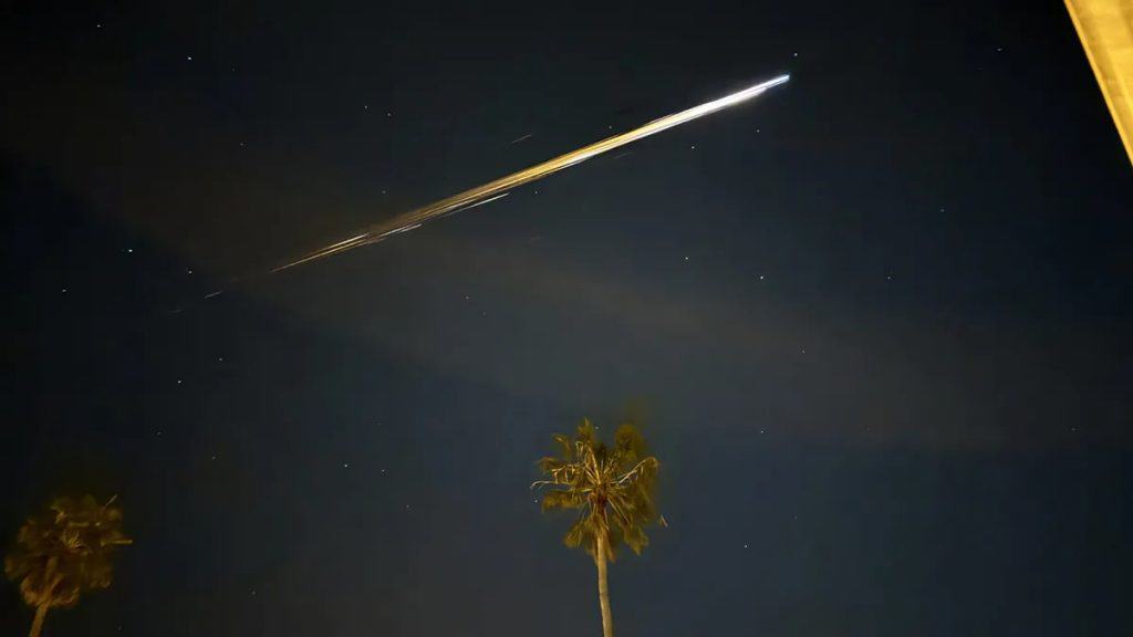 A queda descontrolada de um grande módulo espacial sobre o sul da Califórnia em abril de 2024, que iluminou o céu noturno com rastros incandescentes,